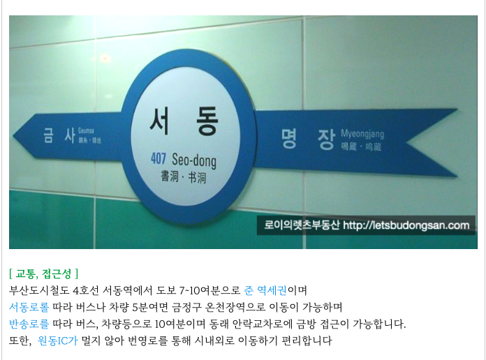 부산도시철도 4호선 서동역에서 도보 7~10여분으로 준 역세권이며