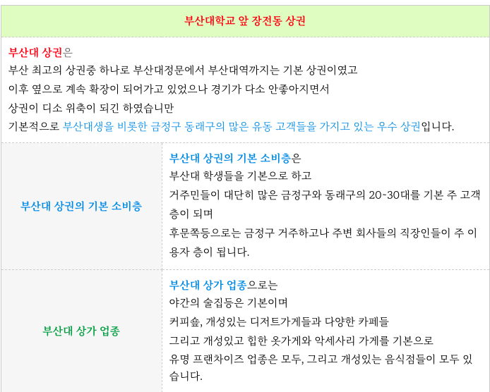 금강로를 기준으로 좌우로 기본 상권으로 두고 부산대 지하철역까지 상권이 이어져 있습니다.