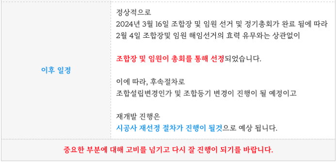 금번 조합장 선거로 인해 다소 많은 부분이 해소되어 향후 진행에 힘을 받을 것으로 보입니다.