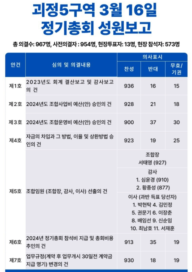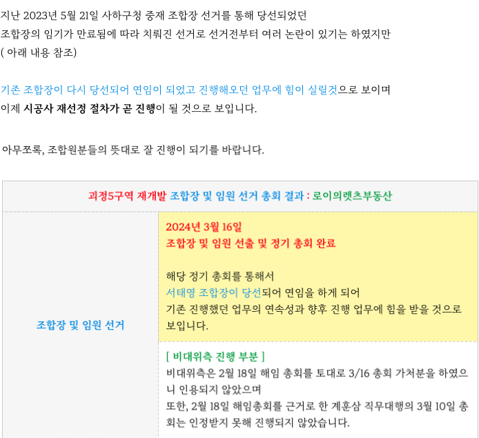 괴정5구역 재개발은 지난 주말 3월 16일 조합장 및 임원 선거 및 정기총회가 있었습니다.