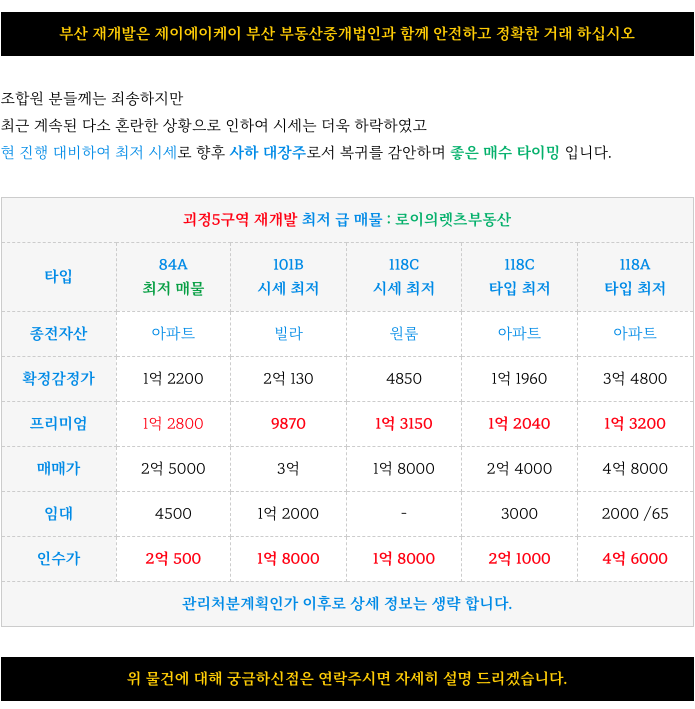 괴정5구역 재개발 각 타입별 최저 매물 정리 소개 드립니다.