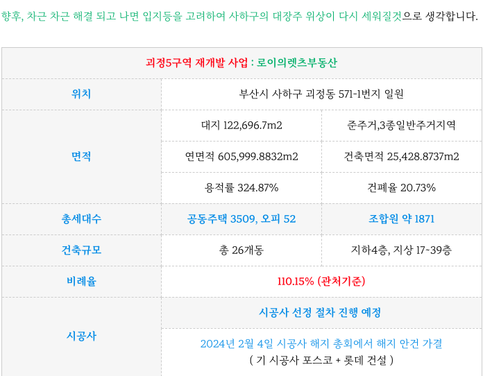 괴정5구역 재개발 전반적인 진행 상황 정리 등 추가 정보는 아래 페이지를 참고 부탁드립니다.