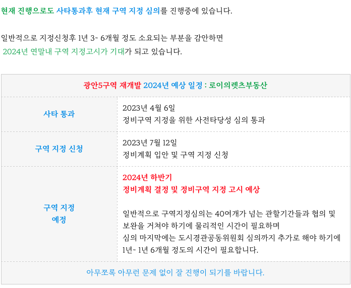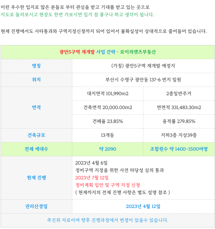 광안5구역 재개발 현재까지의 주요 진행 부분등 추가적인 정보는 아래 페이지를 참고 부탁드립니다.
