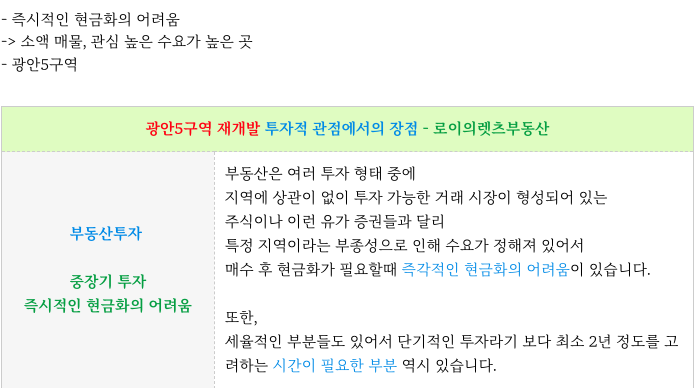 광안5구역 재개발 투자적 관점에서의 장점 요소를 정리하였습니다.