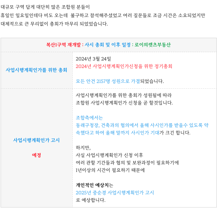 사업시행계획인가 총회 완료로 향후 사시 예상 일정등 가시적인 진행이 보이고 있는 중으로
