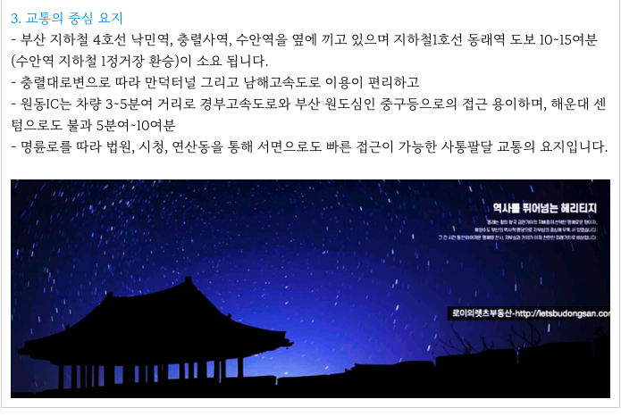충렬대로를 따라 만덕을 통해 남부고속도로, 반대편으로는 해운대로 접근이 용이하며