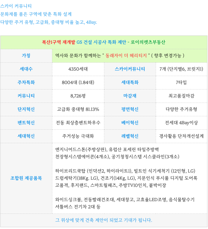 복산1구역 재개발 GS 건설 특화 제안 내용을 정리해 드립니다.