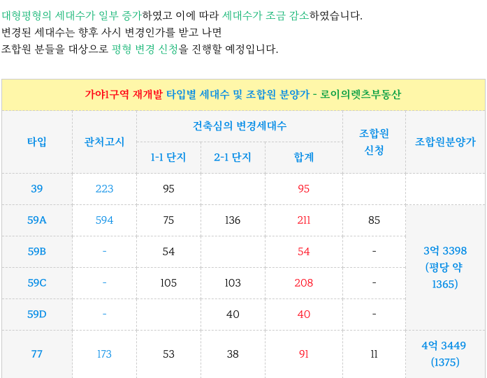 가야1구역 재개발 현 / 변경 타입별 세대수 정리하였습니다.