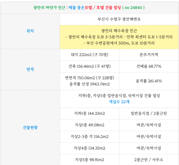오늘 광안리 바닷가 인근 : 매물 좋은모텔 / 호텔 건물 빌딩 매물 상세 제원 소개해 드립니다.