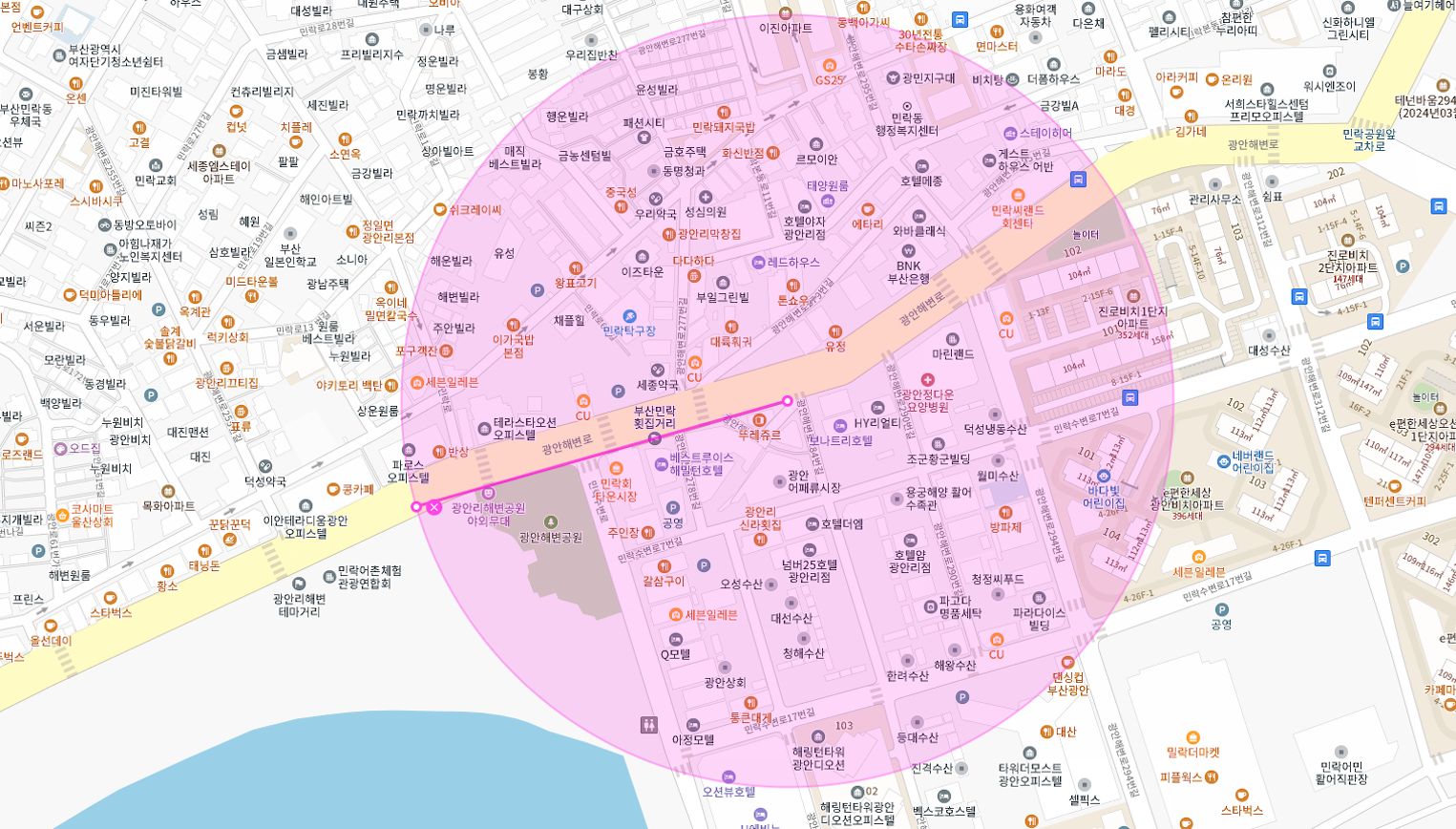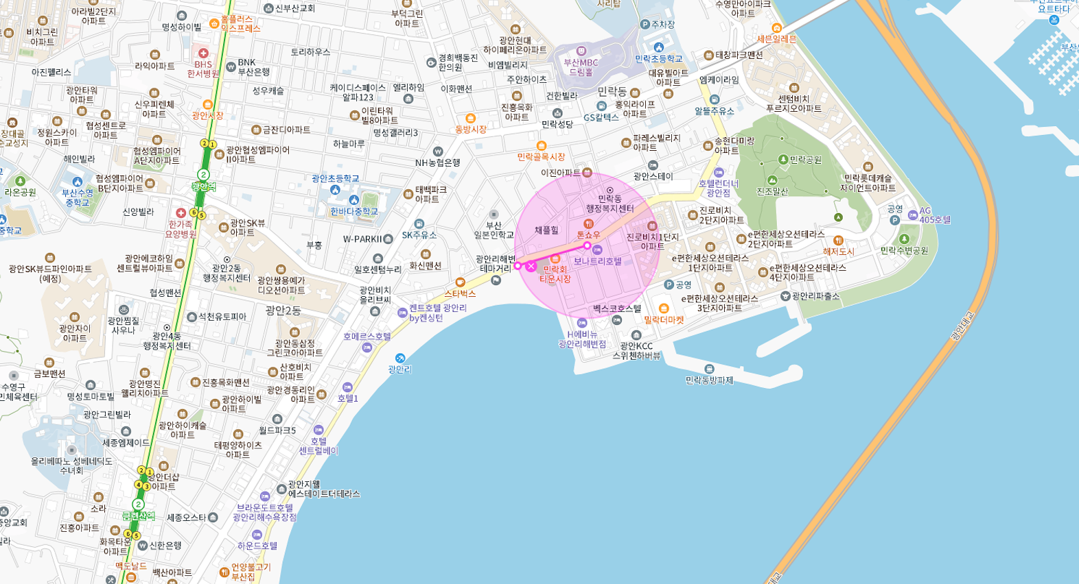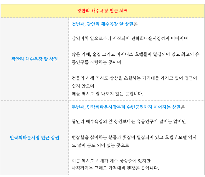 광안리 해수욕장 앞 상권을 중심으로 주변의 민락회센터 그리고 수변공원까지 확장되어