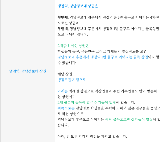 냉정역에서 경남정보대로 이어지는 블록이 중심 상권으로