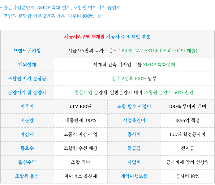 조합원 자기기분담금 입주 2년후 납부, 이주비 100%, 골든타입 분양제등으로