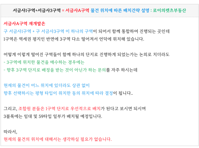 서금사A구역 재개발 자주 문의 주시는 조합원 배치 부분 간략 설명 드리겠습니다.