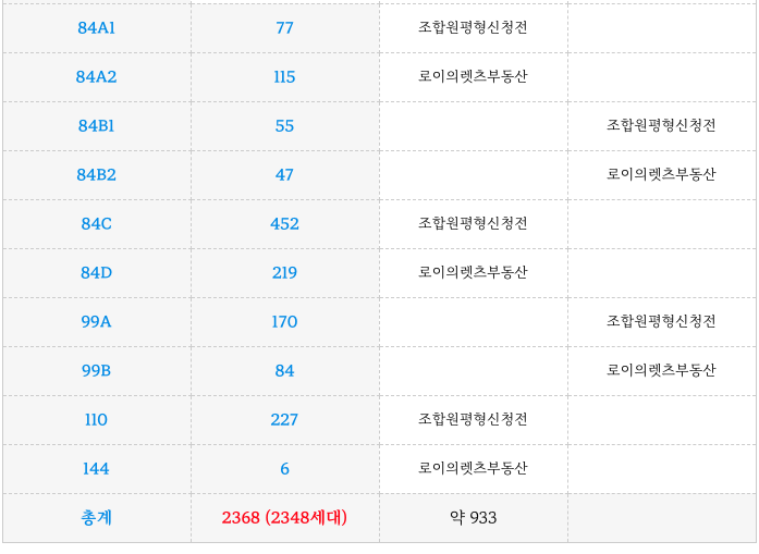 서금사A구역 재개발 시공사 제안 타입별 세대수 입니다.