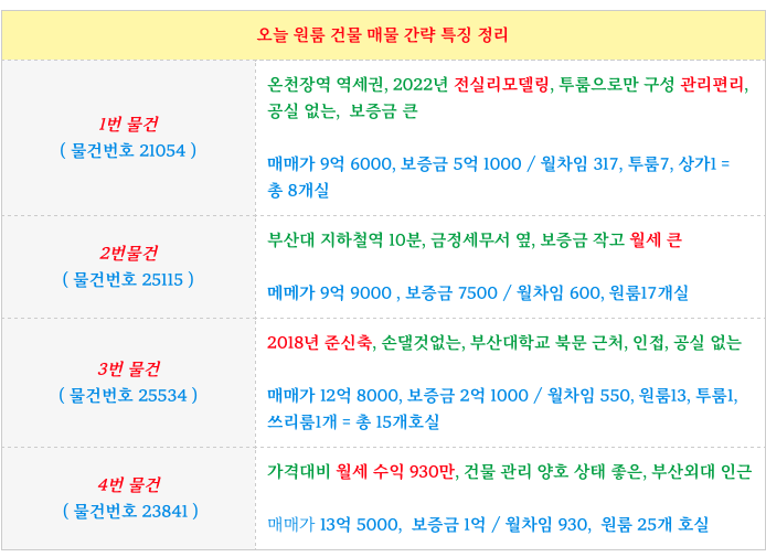 오늘 소개해드리는 4개 물건의 중심 특징만을 먼저 소개해 드리겠습니다.