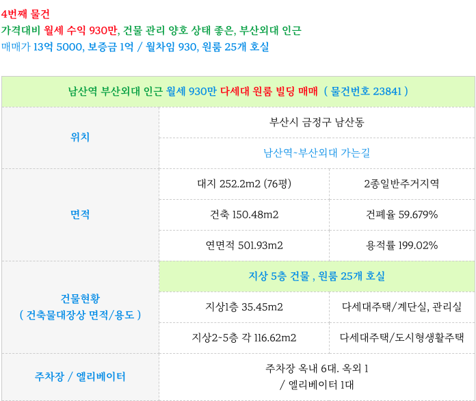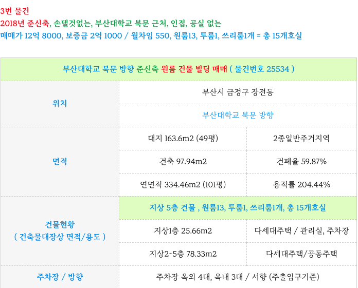 | 부산 만덕 역세권 공실없는 올근생 꼬마 3층 건물 매매 (엘베유) (1) | 2024.04.20 |