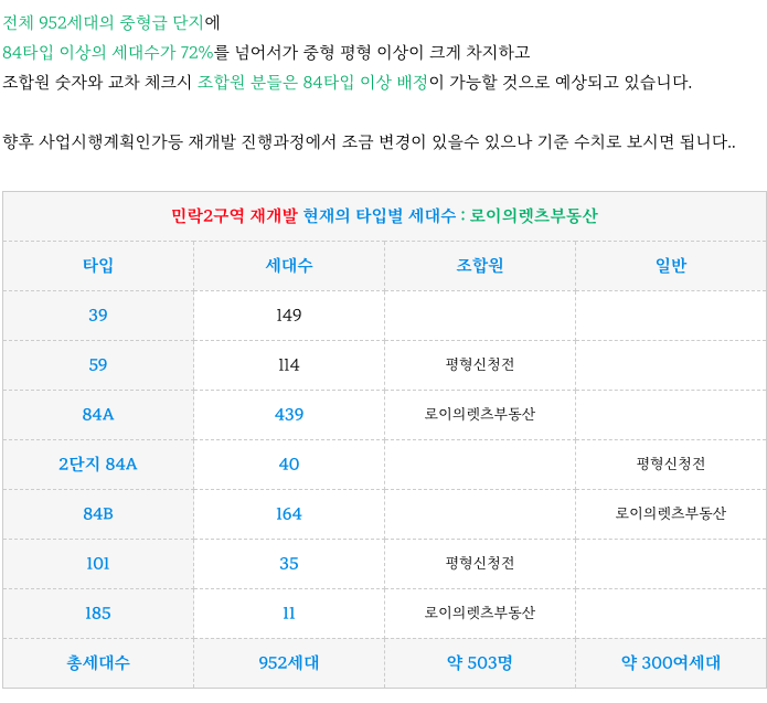 민락2구역 재개발 현재 시점에서의 각 타입별 세대수 입니다.