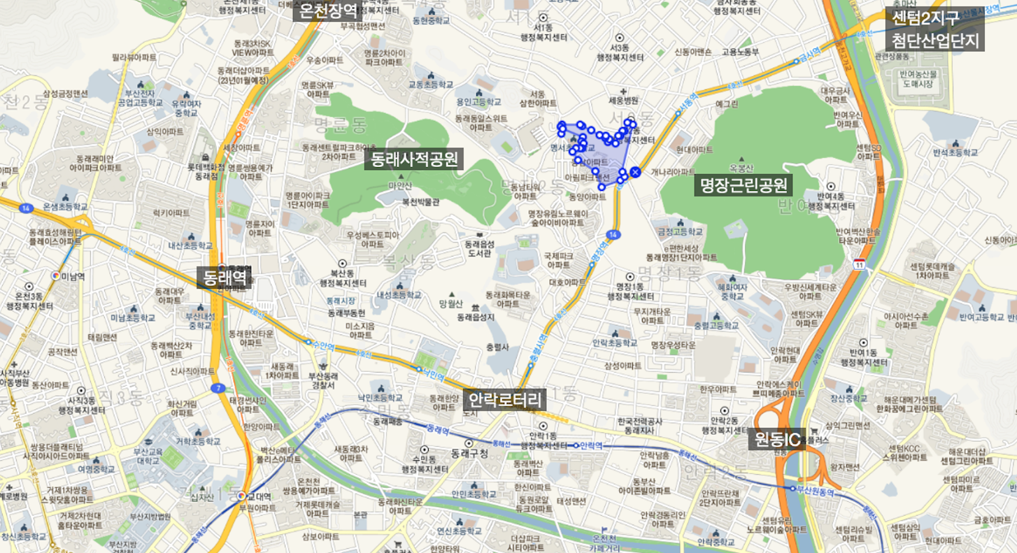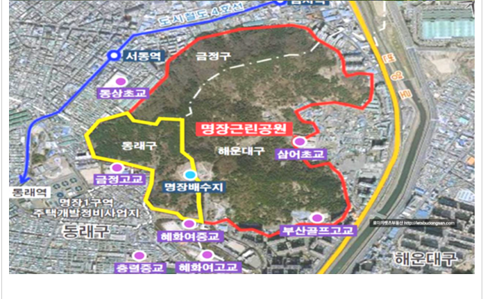 동래구 명장동과 금정구 서동에 걸쳐 있는 재개발 구역입니다.