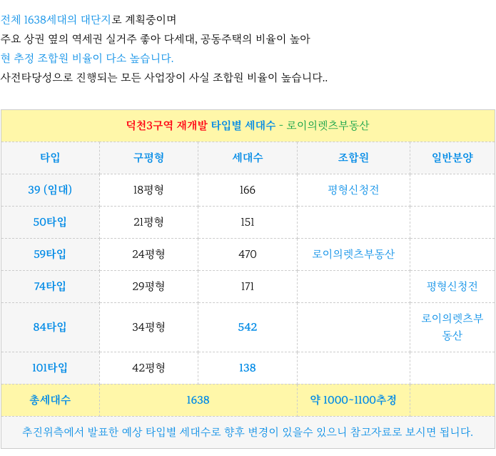 덕천3구역 재개발 추진위 추정 예상 타입별 세대수 소개 드립니다.
