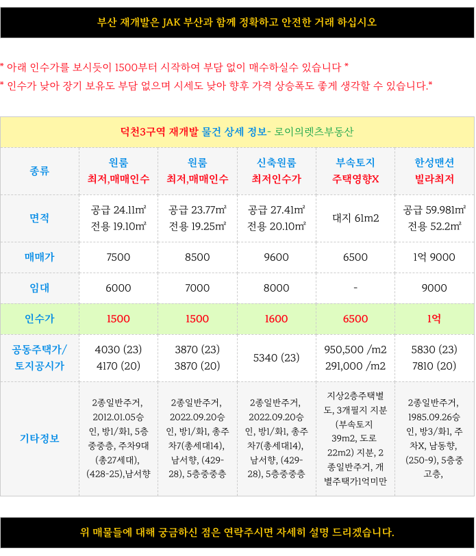 덕천3구역 재개발 부산시내 최저 인수가 소액 인수처 인수가 작은 매물들 정리하여 소개 드립니다.