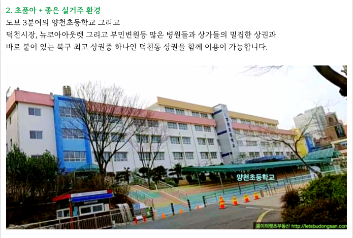뉴코아 아울렛, 덕천시장, 덕천동 젊음의거리, 부민병원 성심병원등 주거 인프라가 좋습니다.