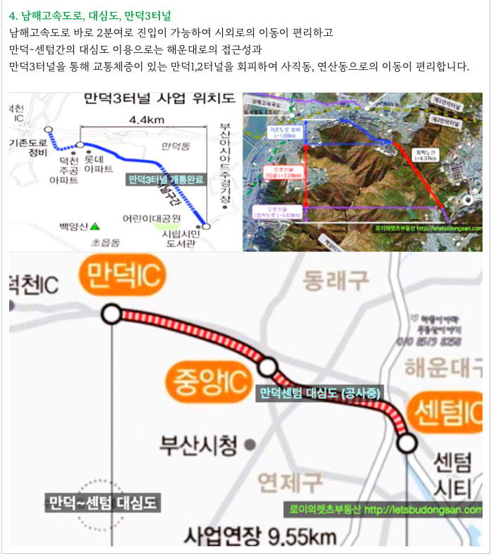 - 시내외 접근성 우수 ( 남해고속도로, 대심도, 만덕3터널 ).
