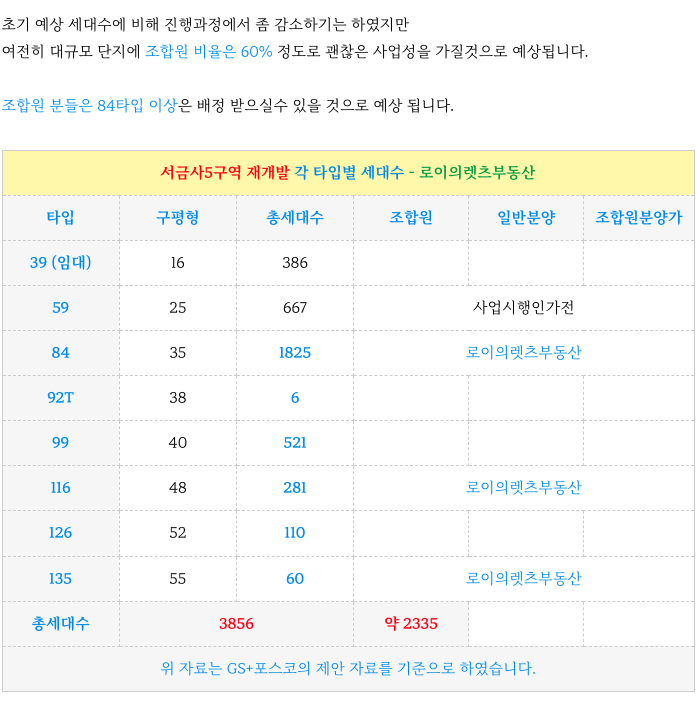 서금사5구역 재개발 시공사 제안안 기준 공급 타입별 세대수 입니다.