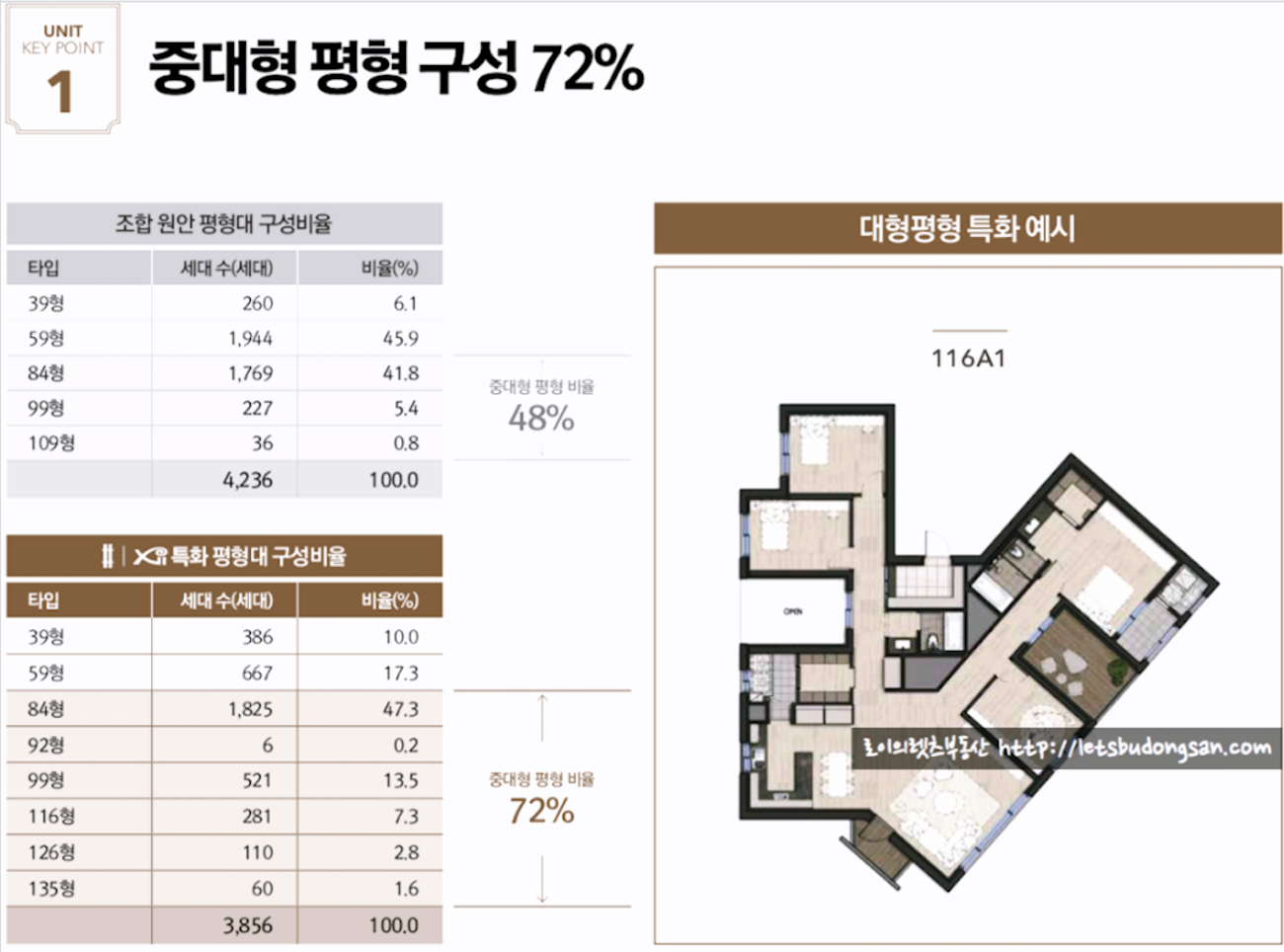 - 84타입 이상이 72%이상, 99타입 즉 40평 이상도 25% 이상의 비율을 차지.
