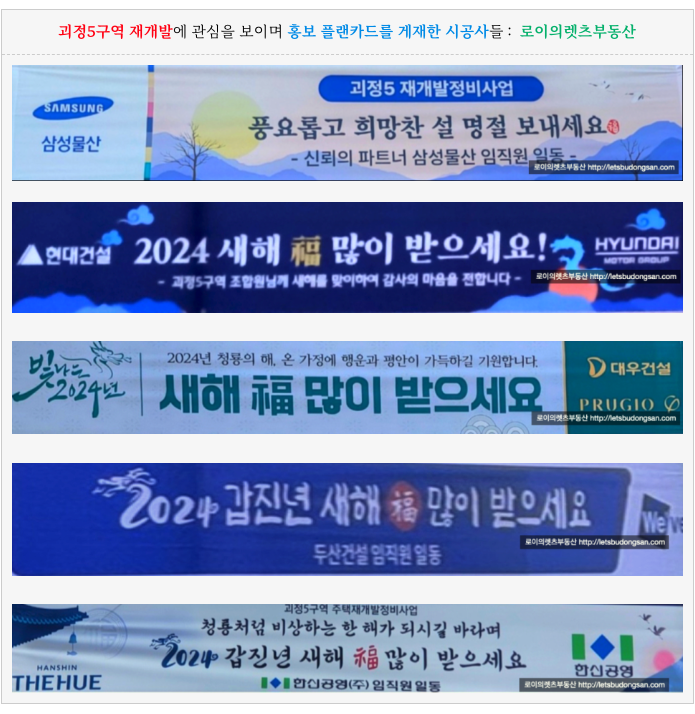 괴정5구역 재개발 관심을 보이며 플랜카드를 걸고 홍보중인 건설사들이 참고 하십시오.