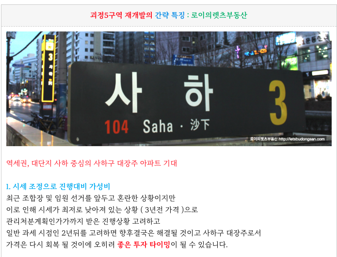 안녕하세요 로이의렛츠부동산 ( JAK 제이에이케이 부산 ) 입니다. 오늘은 사하구 대장주 괴정5구역 재개...