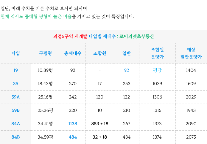 괴정5구역 재개발 관처 기준의 타입별 세대수 및 조합원 예상 분양가 입니다.