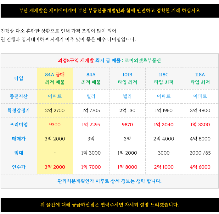 괴정5구역 재개발 접수된 P 최저 급매물 과 타입별 매물 소개해 드리겠습니다.