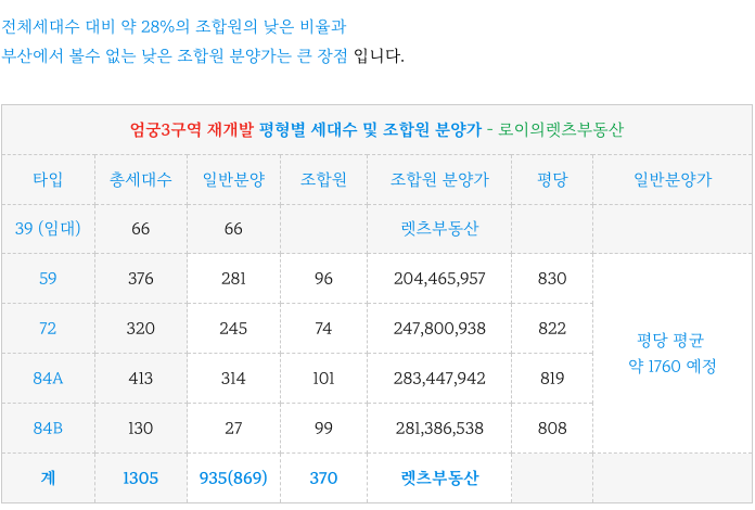 엄궁3구역 재개발 각 타입별 세대수 및 조합원 분양가 입니다.
