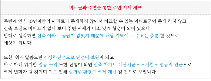 신축 아파트에 대한 수요는 충분할 것으로 예상되어 입주 이후에 시세가 기대 됩니다.