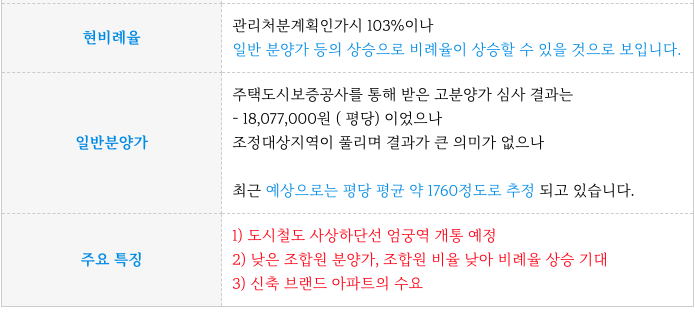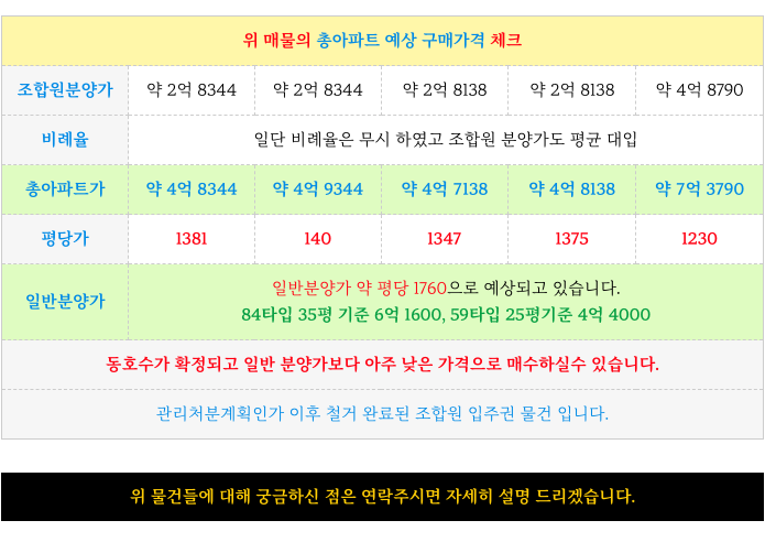 - 낮은 조합원 분양가와 진행 대비하여 시세가 낮으며 최근 가격 조정으로 더욱 착해 졌습니다.