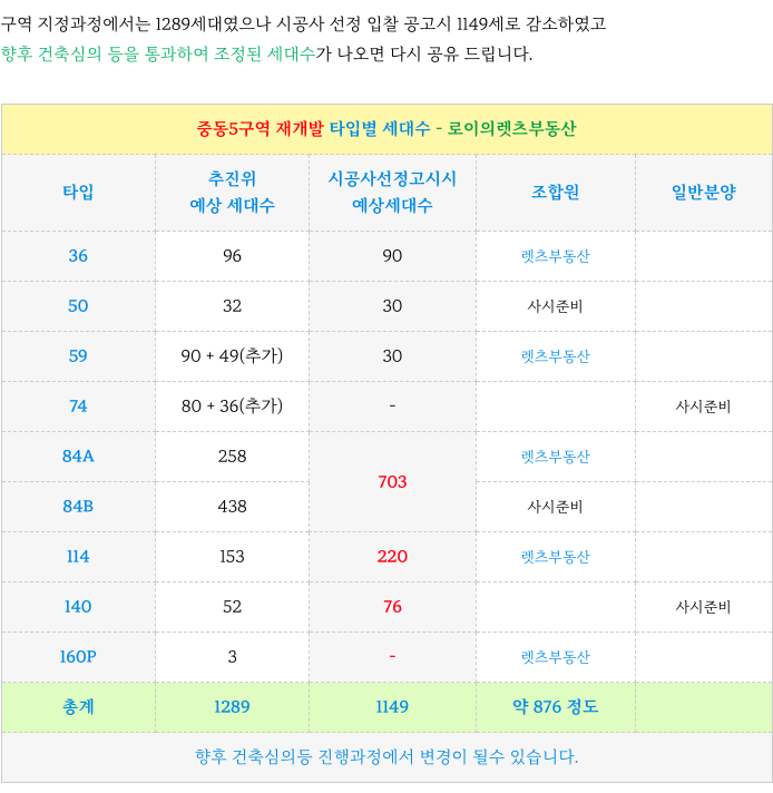 중동5구역 재개발 현재 추정 타입별 세대수 입니다.