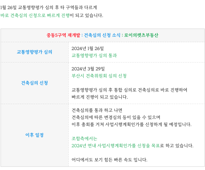 중동5구역 은 최근 3월 29일 건축심의를 접수하여 심의 중에 있습니다.