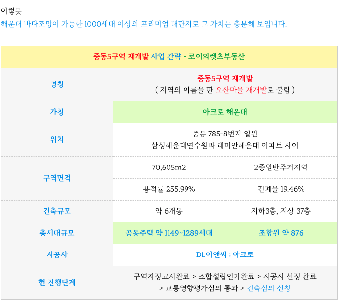 높은 해운대의 시세를 감안하면 일반 분양 없는 재건축으로도 가치 있는 좋은 입지 입니다.
