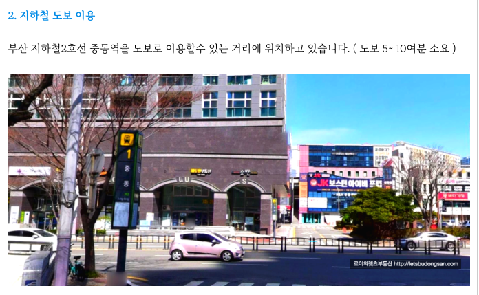 부산 지하철 2호선 중동역에서 도보 5~10분여의 준역세권으로