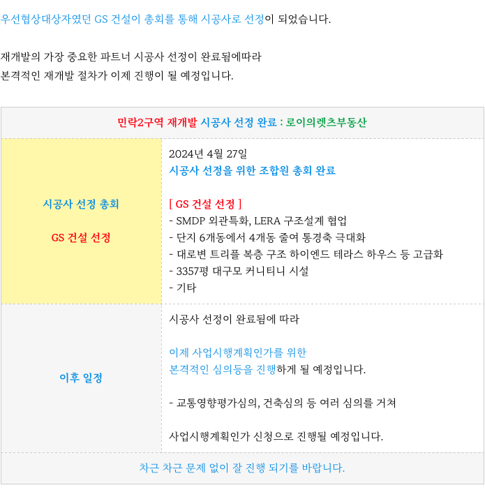 민락2구역 은 지난 토요일 시공사 선정 총회를 진행하였습니다.