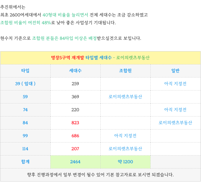 명장5구역 재개발 추정 타입별 세대수 소개해 드립니다.