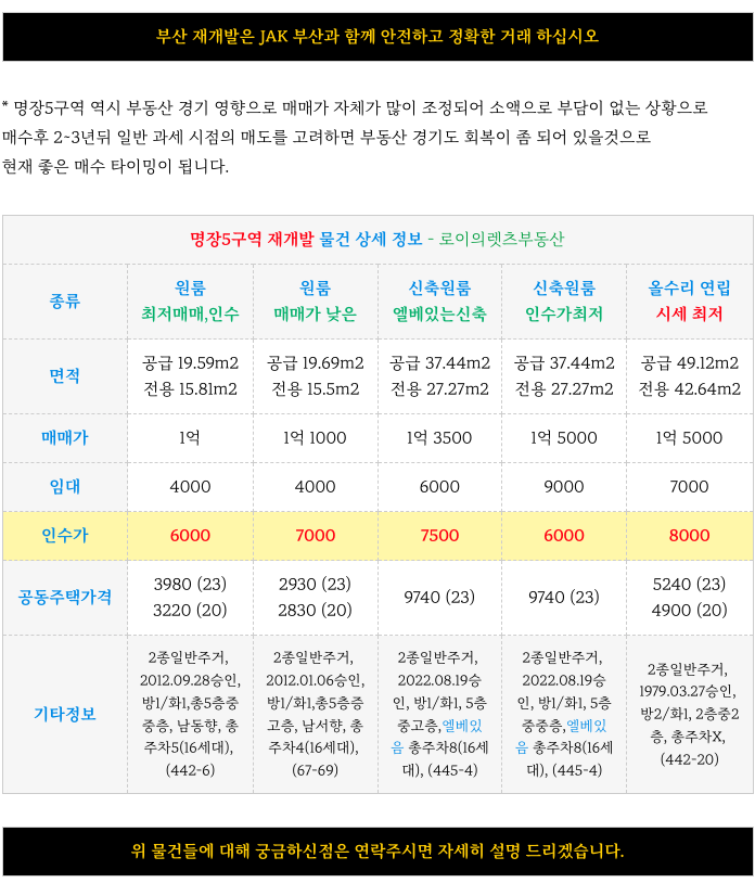 명장5구역 재개발 현 시장 최저 소액 매물들 소개해여 드리겠습니다.