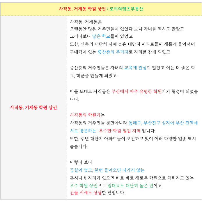 그럼, 먼저 오늘 매물이 위치한 사직동, 거제동 학원가 상권에 대해 간략 설명 드리겠습니다.