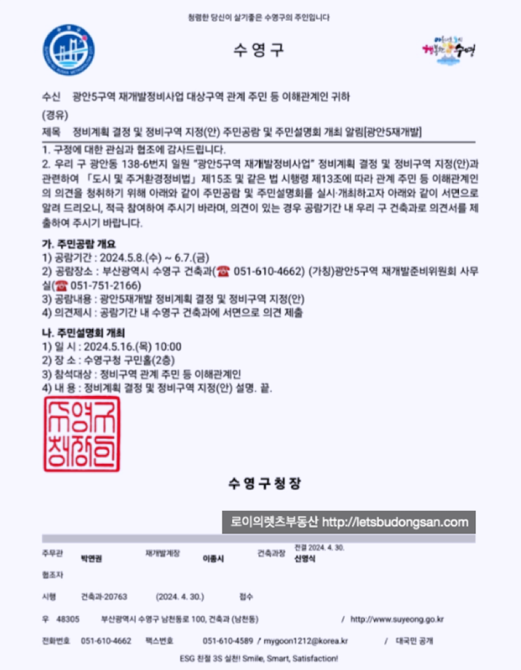 광안5구역 재개발 : 매물 & 구역지정 공람공고, 주민설명회 개최 소식
