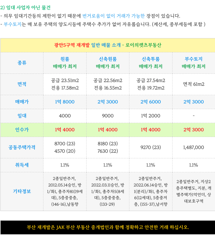 광안5구역 재개발 최저 매물 정리하였습니다.