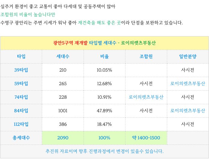 광안5구역 재개발 추정 타입별 세대수 소개 드립니다.