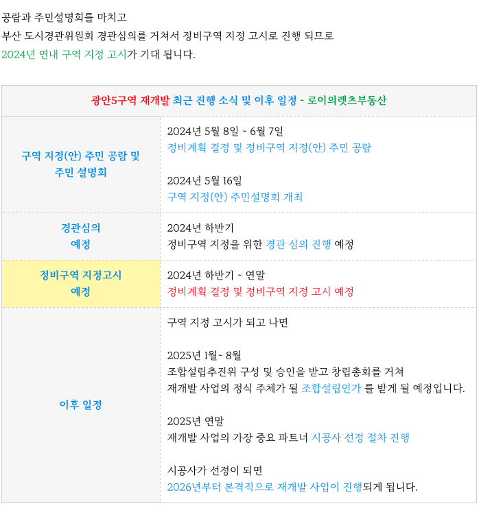 광안5구역 재개발 일자별 주요 진행 부분 및 이후 일정 정리등 추가 정보는 아래 페이지를 참고 부탁드립니다.