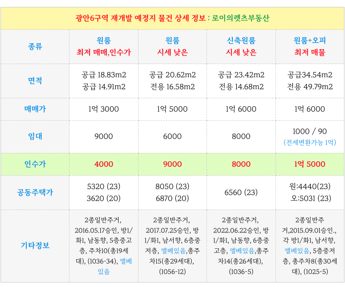 광안6구역 재개발 최저 시세, 인수가 매물들 정리 소개 드립니다.