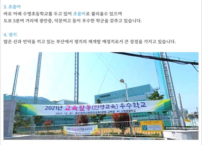 수영초등학교를 도보 2분여 바로 아래 두고 있는 초품아이며