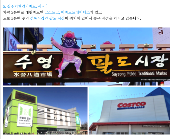 수영 전통시장인 팔도시장과, 수영역 인근의 많은 병원과 상가 등 상권 이용이 편리하고